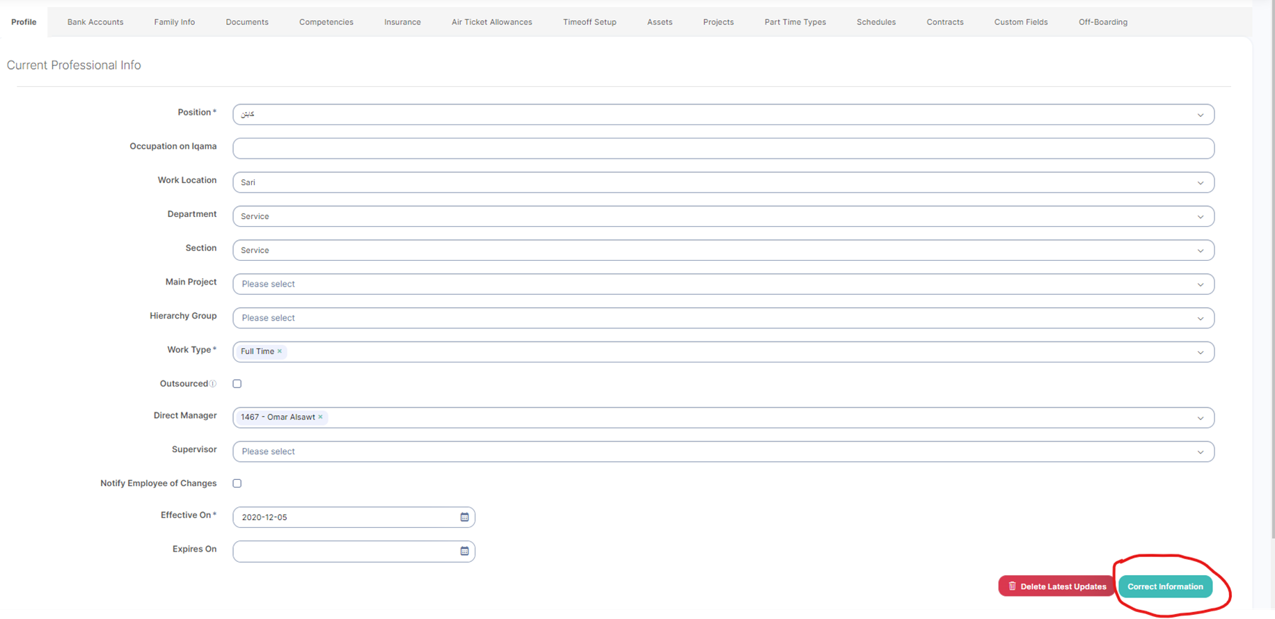 Kindly note, When the employee's data is updated, please click on Correct information to be transferred to the NetSuite