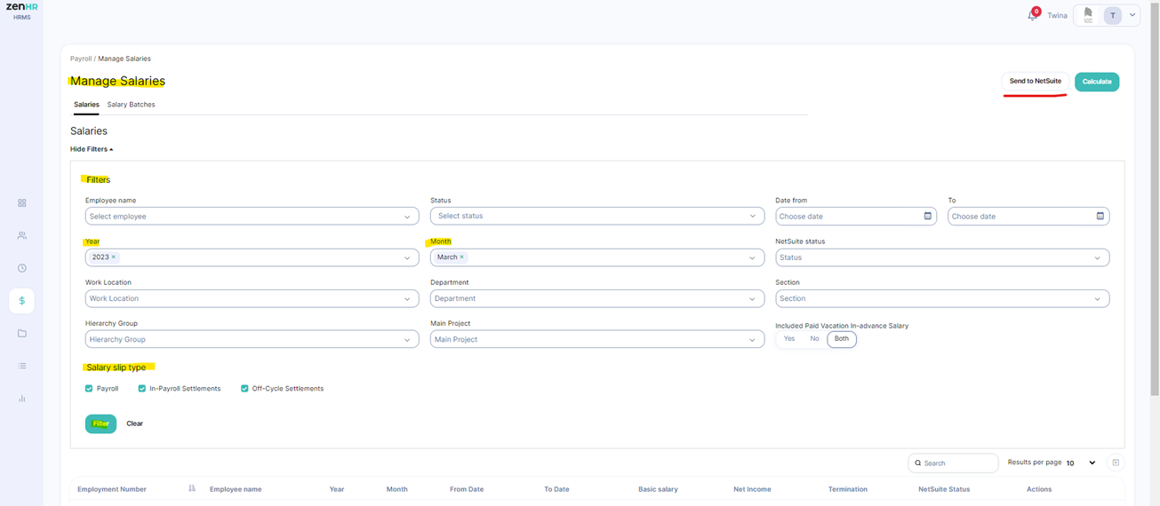 (Payroll, In-Payroll Settlements and Off-Cycle Settlements then select employees and click sent to NetSuite)