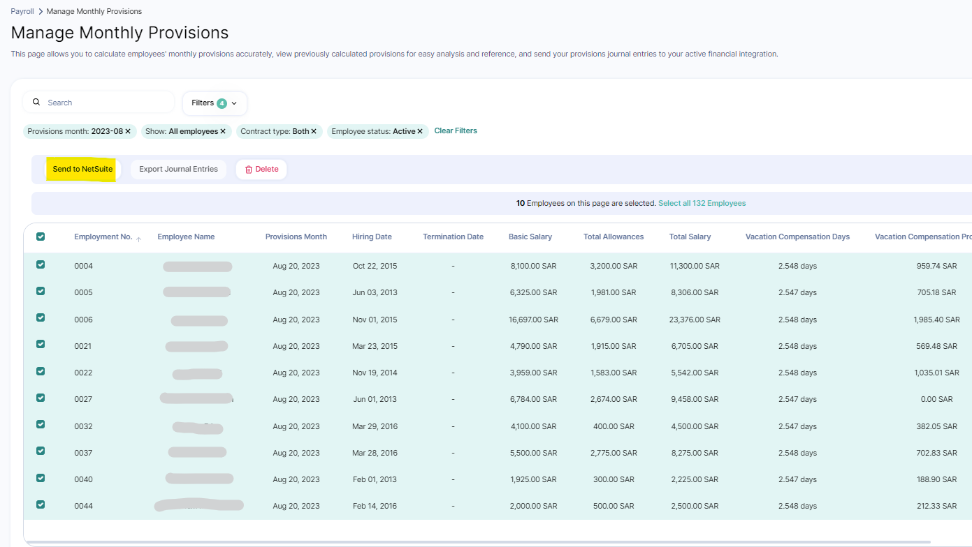 3. Select employees> After selecting employees you will see Send to NetSuite