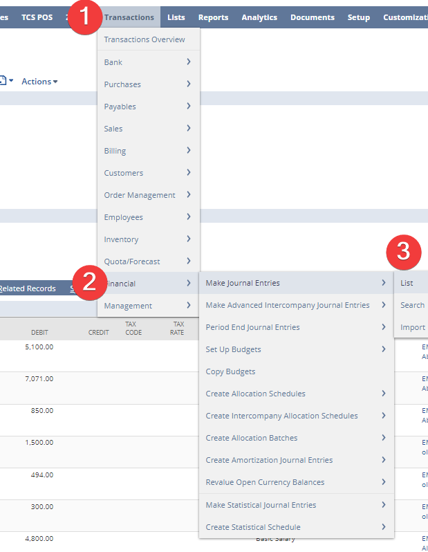 2. Select Transactions>Financial > Make Journal Entries> List.