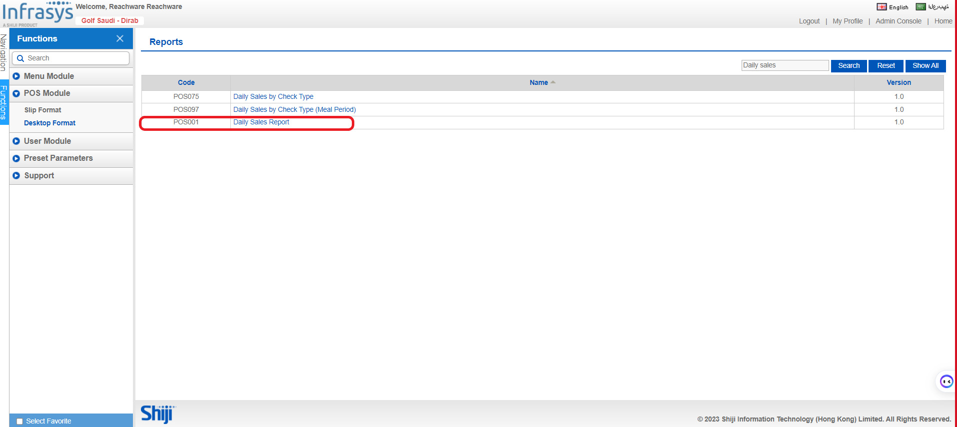 B. POS Module → Desktop Format → Search bar → Daily Sales → POS001 Daily Sales Report
