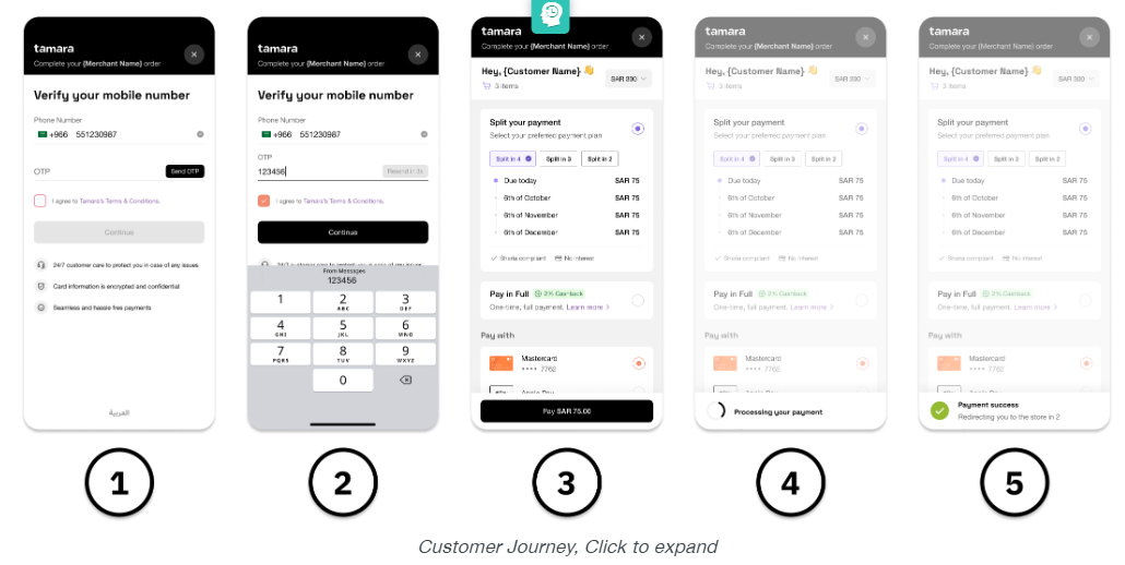 Our server will then redirect the customer to the checkout_url received in the above step to complete their Tamara checkout experience.