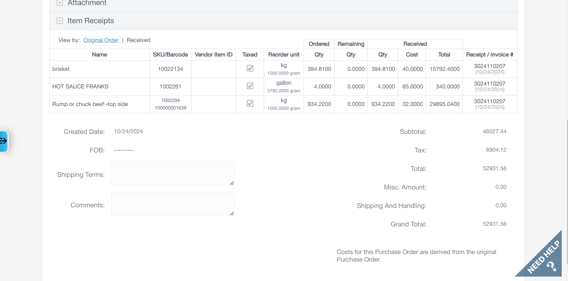 The taken purchase order was on date was 23/10/2024