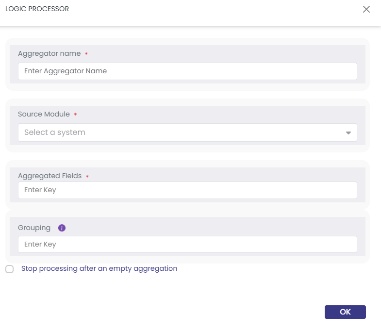 A prompt window will appear, allowing you to define the Aggregator criteria for your data.